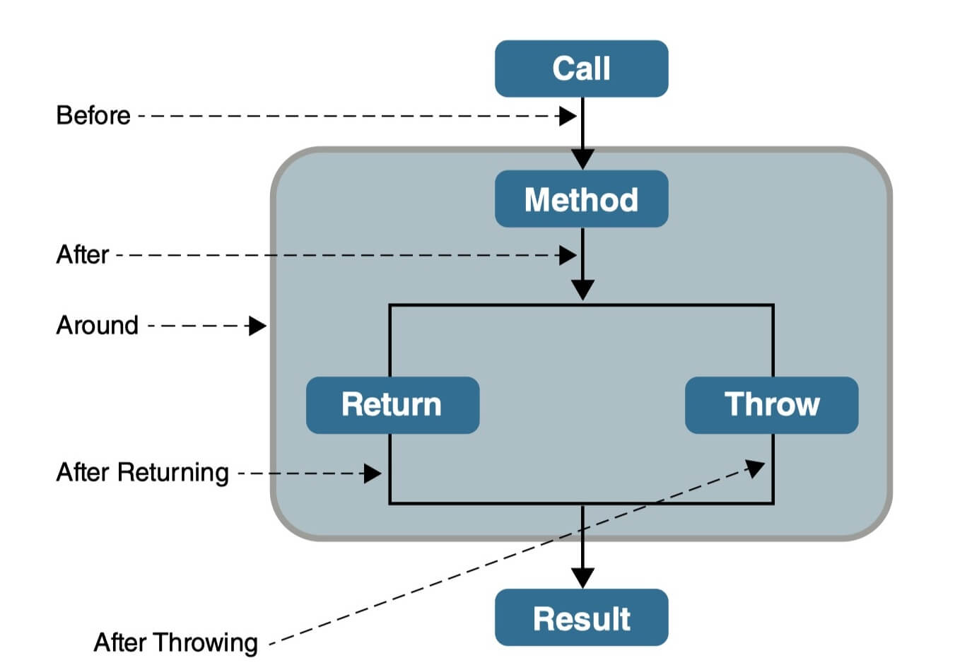 • Around (环绕通知)最为常用的通知类型,编程式控制目标对象的方法调用。环绕通知是所有通知类型中可操作范围最大的一种,因为它可以直接拿到目标对象,以及要执行的方法,所以环绕通知可以任意的在目标对象的方法调用前后搞事,甚至不调用目标对象的